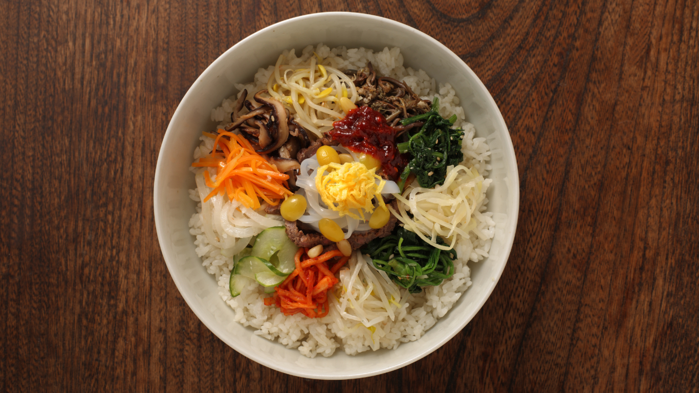 - Ingredients: Rice, julienned carrots, spinach, mushroom slices, bean sprouts, beef strips, egg, Korean chili paste (Gochujang), sesame oil, soy sauce, minced garlic