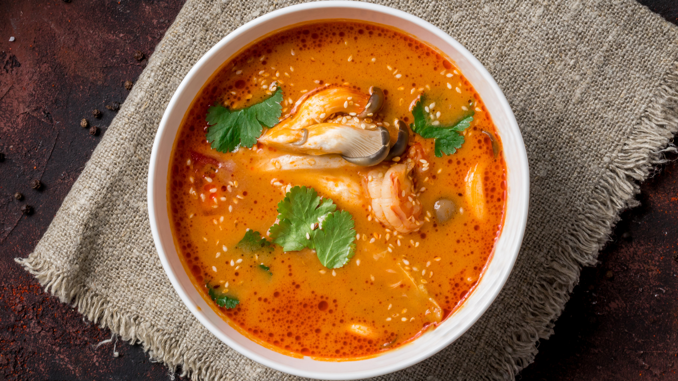 - Ingredients: Shrimp, lemongrass, kaffir lime leaves, Thai chili peppers, mushrooms, lime juice, fish sauce, chicken broth, cilantro
