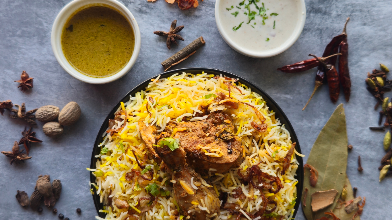 - Ingredients: Rice, chicken pieces, onions, tomatoes, yogurt, various spices (such as cumin, cloves, cinnamon, turmeric, chili powder), cilantro, mint leaves