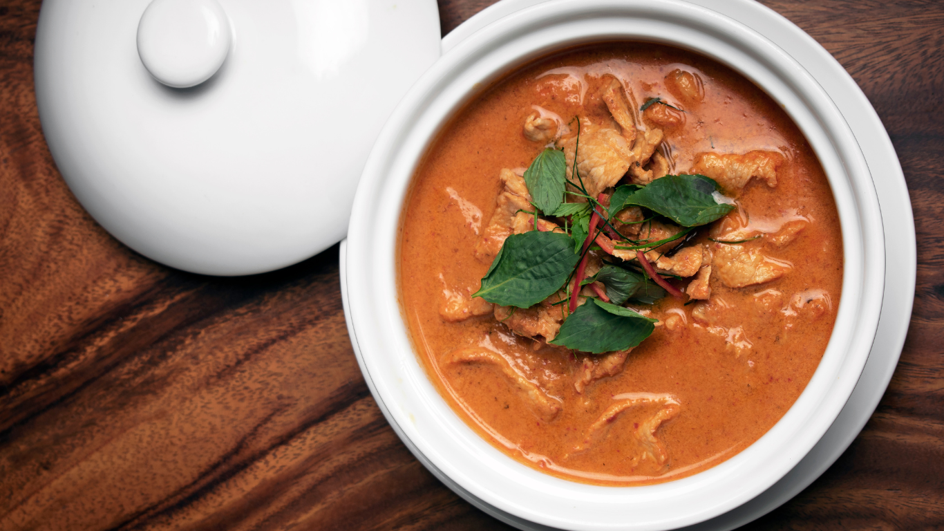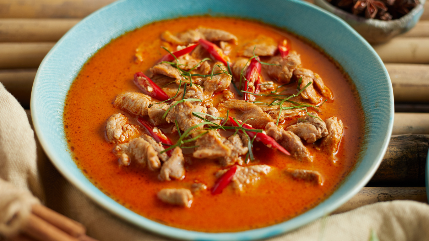 - Ingredients: Rice, chicken breast pieces, coconut milk, red curry paste, carrot chunks, green peas, onion chunks, fish sauce, sugar