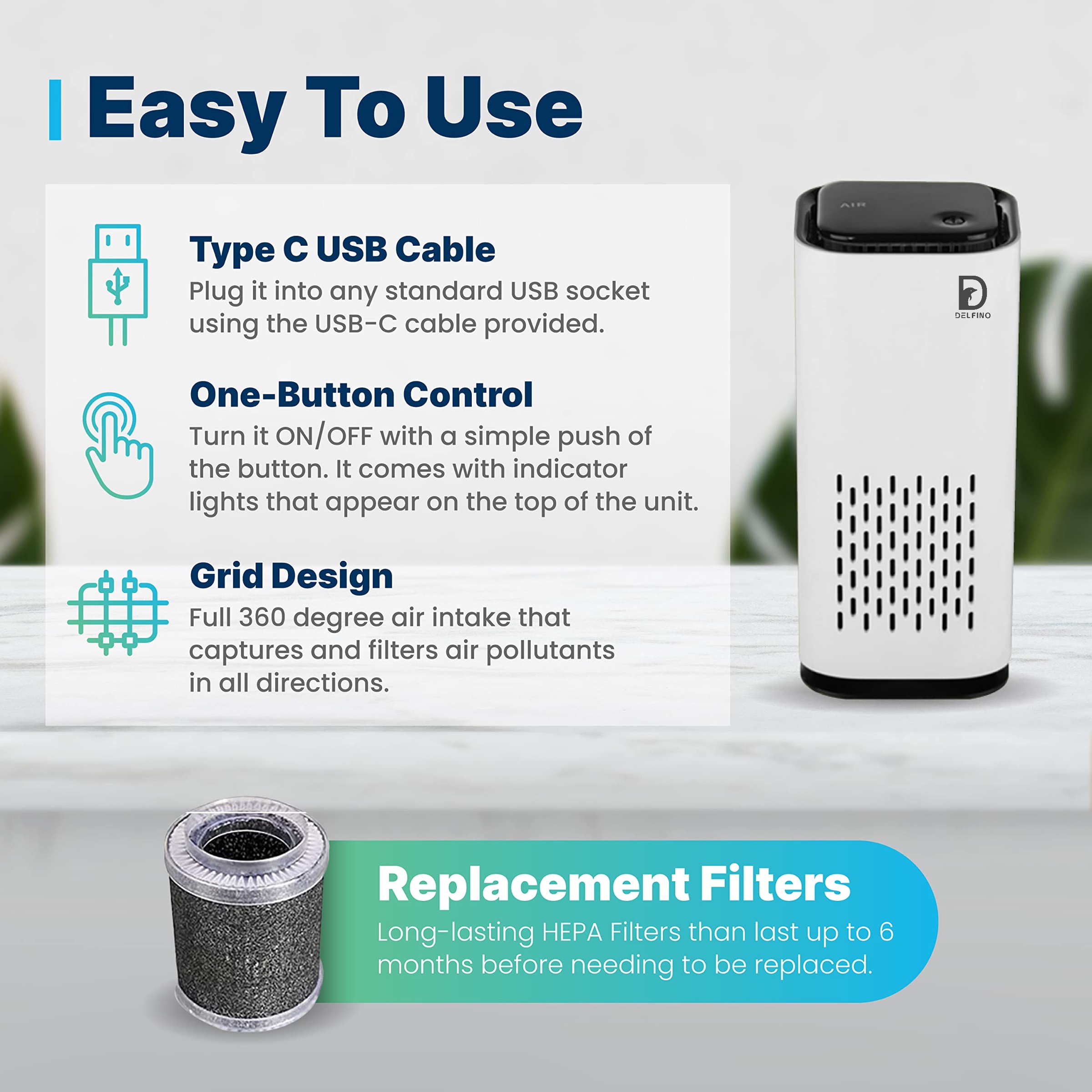 Delfino Kiyomeru USB Air Purifier HEPA Filter With Activated Anion Carbon Filter