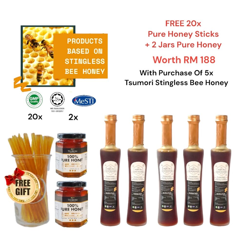 (Combo 5-20+2) Tsumori Stingless Bee Honey Booster 5pcs FREE Tsumori Pure Honey Jars + Tsumori Pure Honey Stick 20pcs